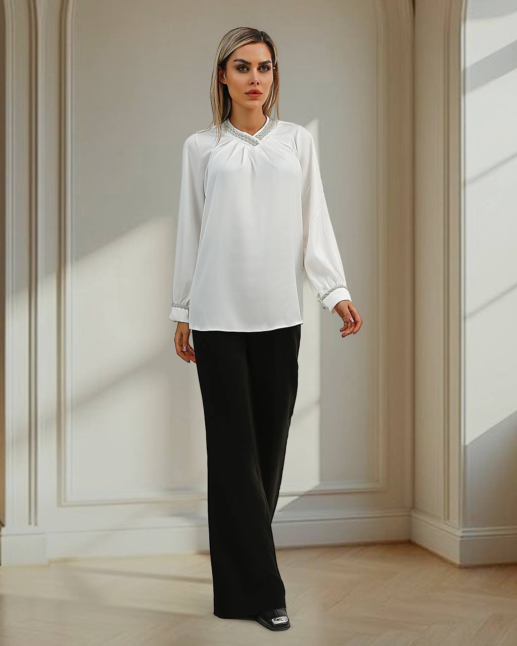 مناسب هر اندامی حتی خانم هایی که شکم پهلو دارن بخاطر پیله های زیر یقه و ریزش پارچه راحت ایراد اندامی پوشش میده با خیال راحت میتونین استایل کنین